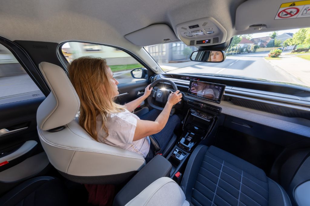 There’s even what Citroen calls a Head-Up Display (HUD), although this isn’t where the graphics are beamed onto the windscreen as you’d expect of a normal HUD. Instead, it’s a readout behind and above the small steering wheel – actually a simple reflective black panel that the speedo is beamed onto, as that’s cheaper than a conventional screen readout. It looks neat, though, and is an important features as I prefer having the speedo behind the steering wheel like this than simply integrated into the central touchscreen like in the Tesla Model 3 and Volvo EX30.