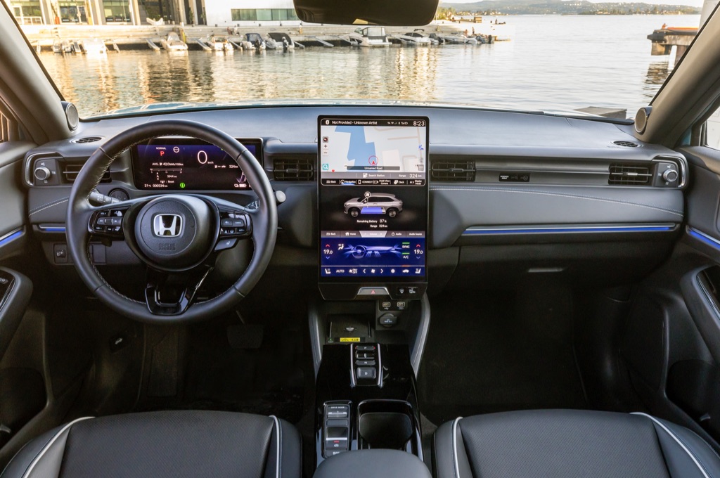 There’s a very neat face with LED headlights and a charge port at the front, then there’s a long bonnet under which is a single motor  rather than a frunk. On the back doors are little hidden door handles which sort of make it look coupe-ish but are likely to confuse passengers the first time they use them, Then on the tailgater there's and a full width lightbar with HONDA in big script… in case you forget what car you are driving.