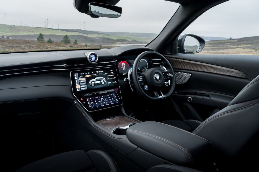 Anyway, enough of my peculiar Maserati steering wheel fetish. The rest of the interior feels classy but it doesn’t have the same lustre of the BMW iX, Porsche Macan, Polestar 3 or Lotus Eletre. There are two screens – the top one for the majority of your media stuff and for the nav readout (wireless Apple CarPlay and Android Auto are standard), and the lower for the climate control and other cabin settings.