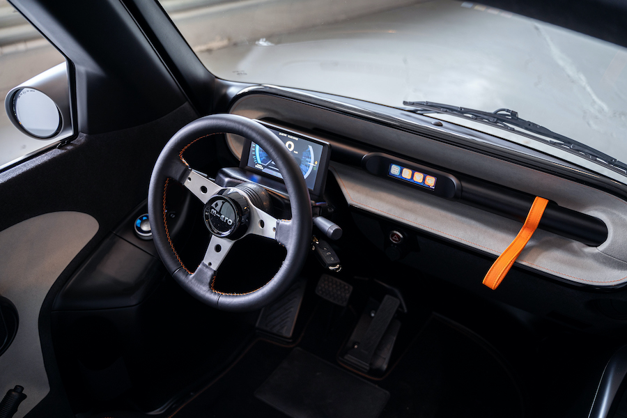 Thankfully, the retro approach doesn’t extend to every element of the Microlino interior. There’s a small display screen positioned above the steering wheel along with basic switchgear on the dash panel and to the left of the steering wheel.