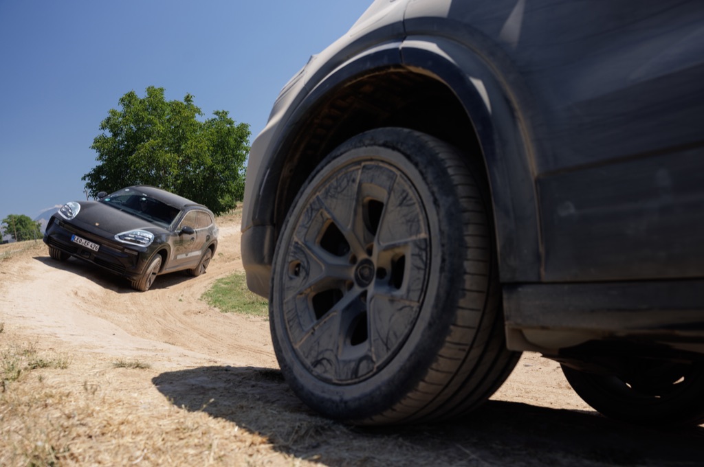 Steep rock steps, narrow passages, sharp twists and turns… There’s no smooth road in sight. Michael Schätzle is not going easy on his electric Porsche Cayenne prototype, which I’m out having a drive in ahead of its world premiere later this year. This is a car that hasn’t even been revealed yet, so you’ll have to forgive the disguise!