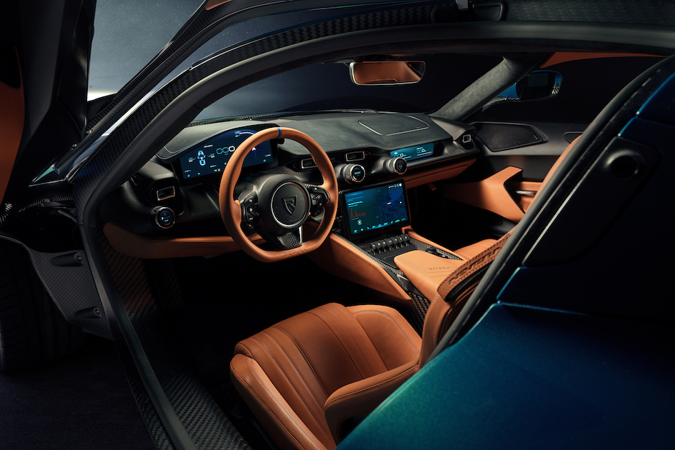 So that the joy of driving does not end in frustration when charging, the Nevera can charge with up to 500 kW – 10 times the speed of a Nissan Leaf. Or rather, it could, if there was a charging station currently capable of providing such speeds.And because Rimac not only wants to set standards in terms of drive and battery, but also in terms of equipment, he has also developed his own infotainment system with six screens and made the Nevera fit for autonomous driving.
