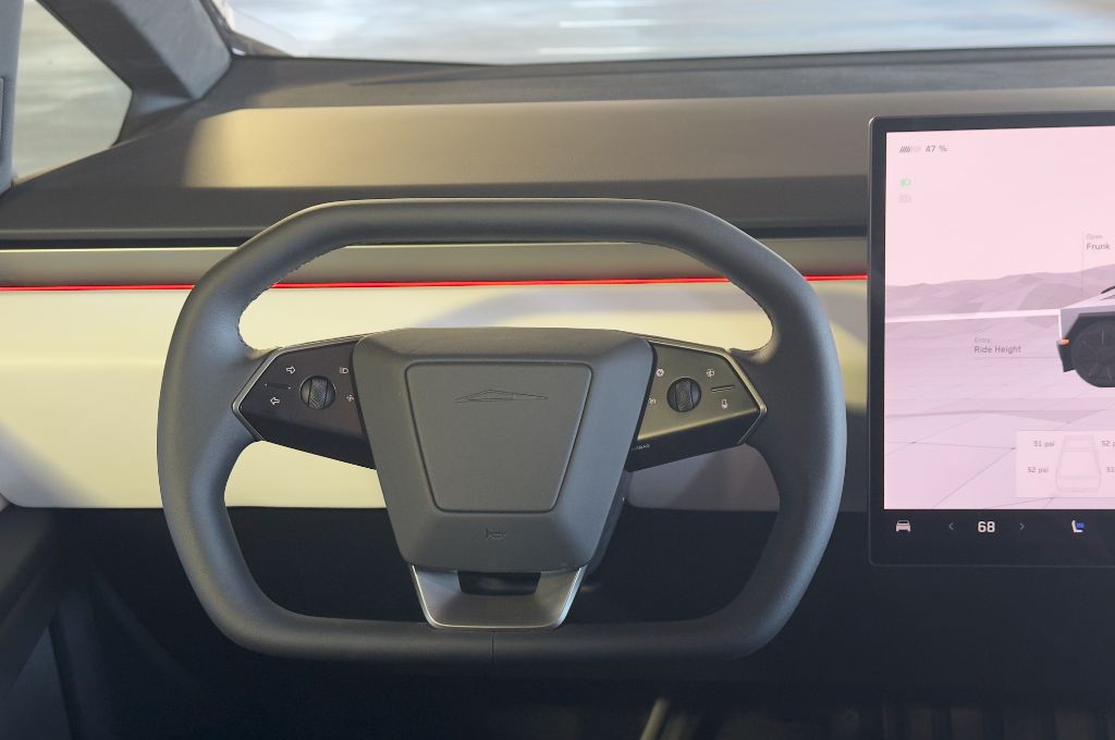 As if the minimal suspension comfort isn't enough, the steering also takes some getting used to. The combination of drive-by-wire technology (which means that there’s no mechanical connection between the steering wheel and the car’s axles) with variable gear ratio and moderate feedback, strong rear-axle steering, heavy-duty Goodyear tyres on 20-inch rims – not to mention the unpleasantly angular steering wheel – makes for some awkward moments, especially when manoeuvering and in city traffic. It takes a little practice, or at least some higher speeds, until the Cybertruck becomes intuitive enough to take corners smoothly.